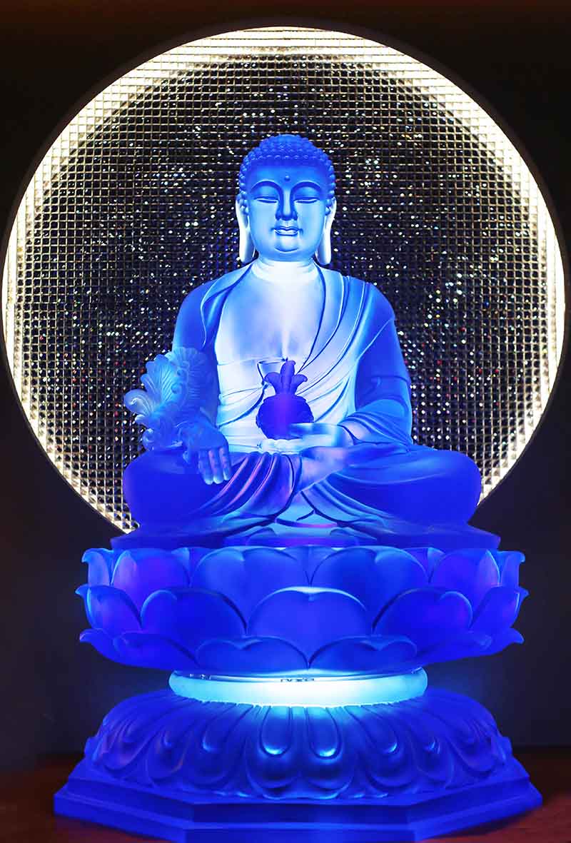 藥師佛在過去世行菩薩道時,曾發十二大宏願,希望世間沒有疾病和傷痛,消除一切的魔障,小至去除有情饑寒、根缺、天災、人難等種種身心怖畏,大至究竟解脫眾生一切憂苦。全身散發琉璃藍色的藥師佛,有著光明的意向,左手捧藥缽,是祂無病無痛十二宏願的代表,療癒眾生萬千病惱。