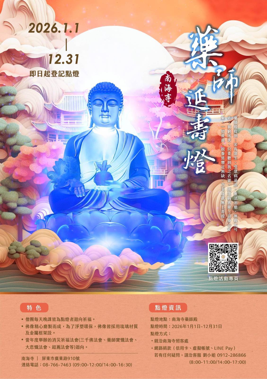 《藥師經》云: 「若諸有情,眾病逼切,無救無歸,無醫無藥,無親無家,貧窮多苦,我之名號一經其耳,眾病悉除,身心安樂,家屬資具,悉皆豐足,乃至證得無上菩提。」 邀請您一起來點藥師延壽燈,為自己及家人的健康祈願,為這個世界的苦難獻出更多光亮和溫暖。