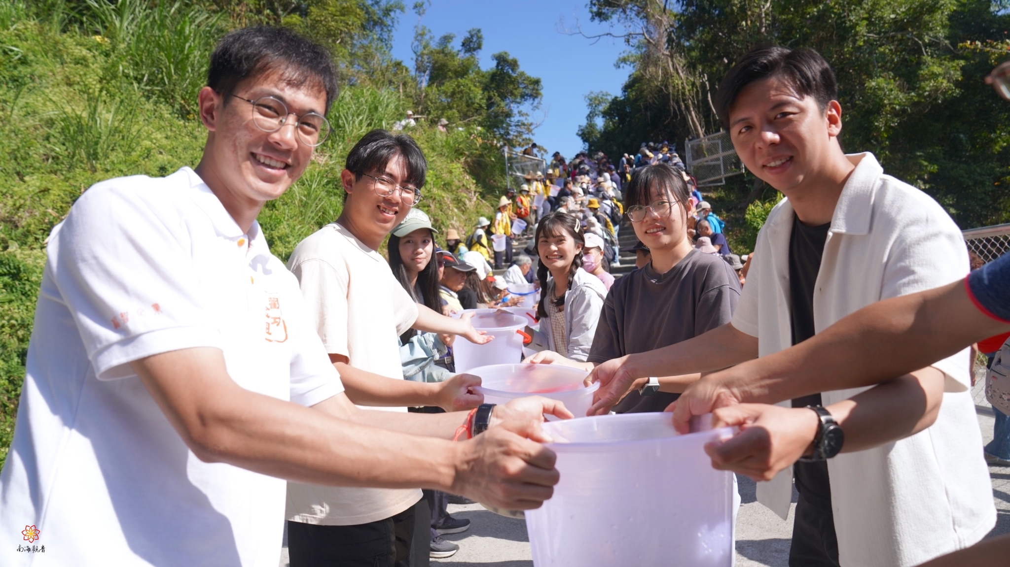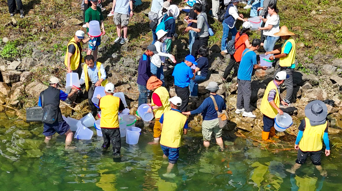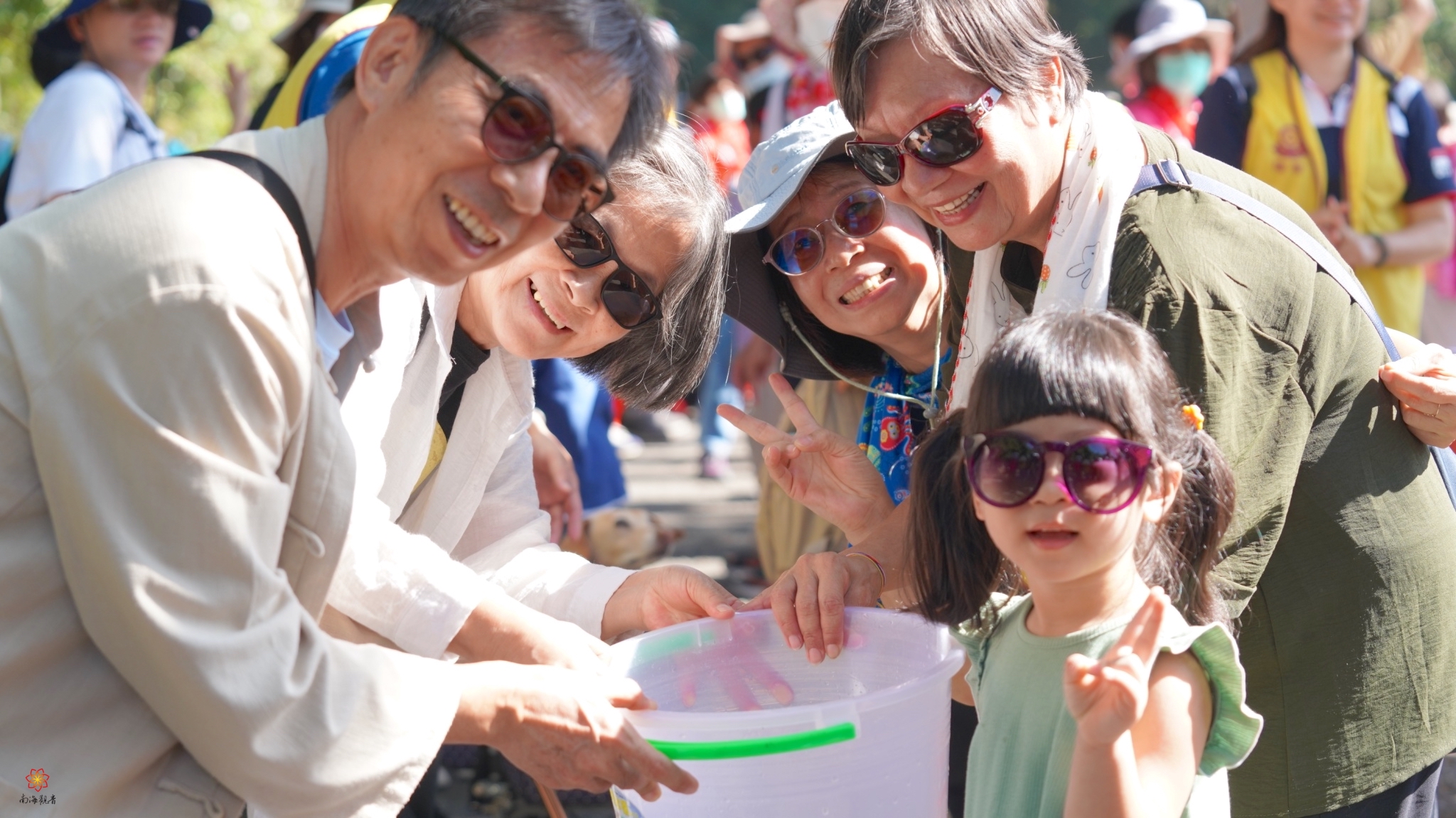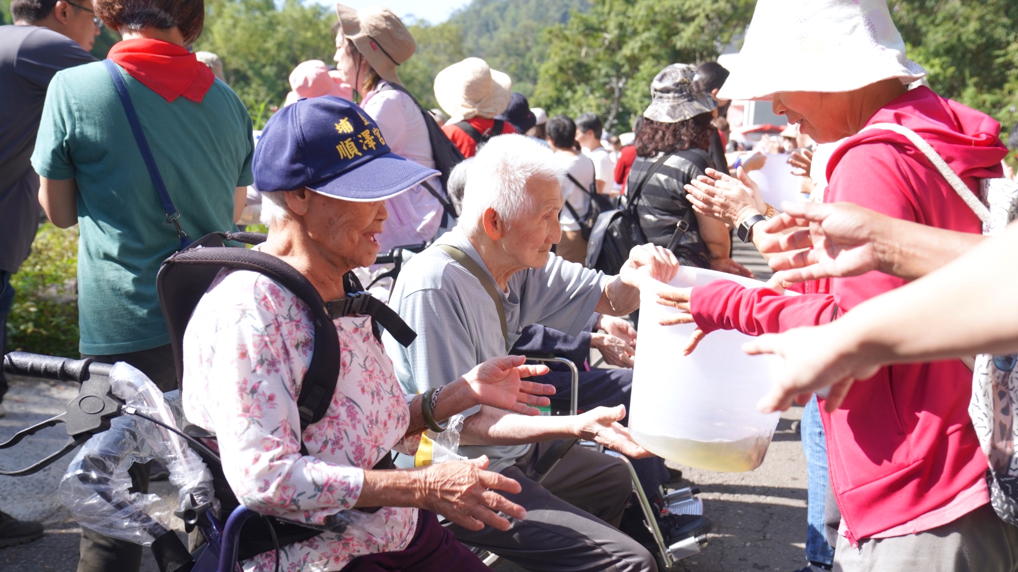 考量許多長者參與活動,沿著放流點的步道平坦、友善,在湖光山色中,闔家攜手散心,留下溫暖足跡。本次活動共吸引約860位民眾扶老攜幼熱情參與,溫馨動人,充滿敬老護生的溫暖力量。