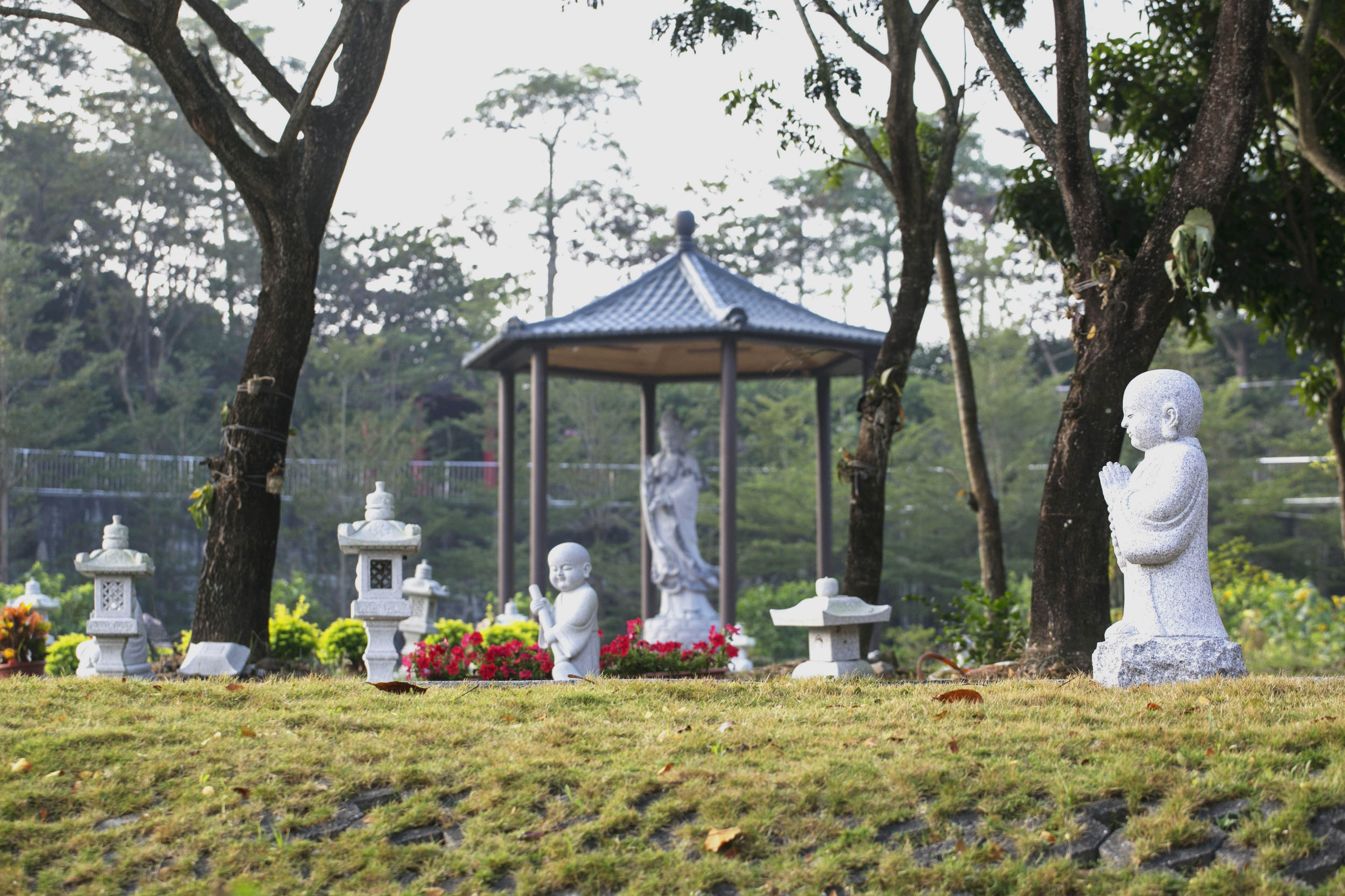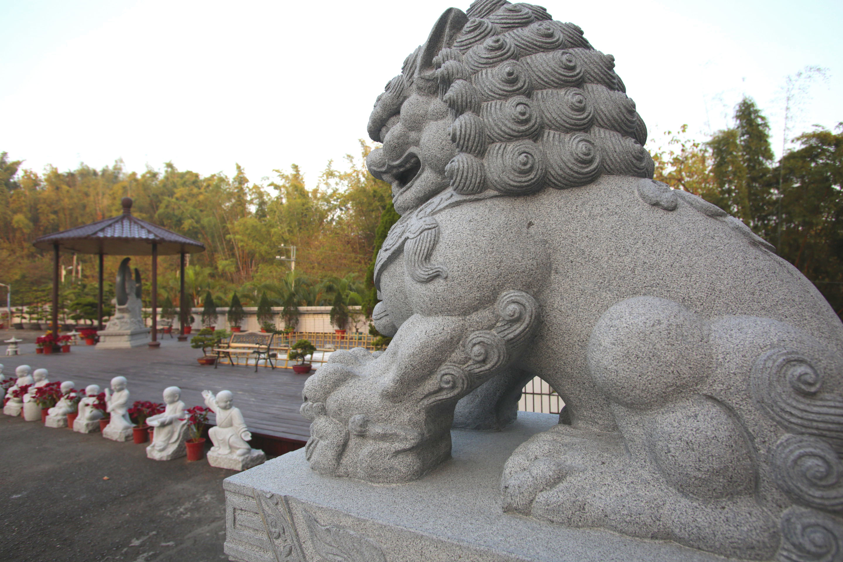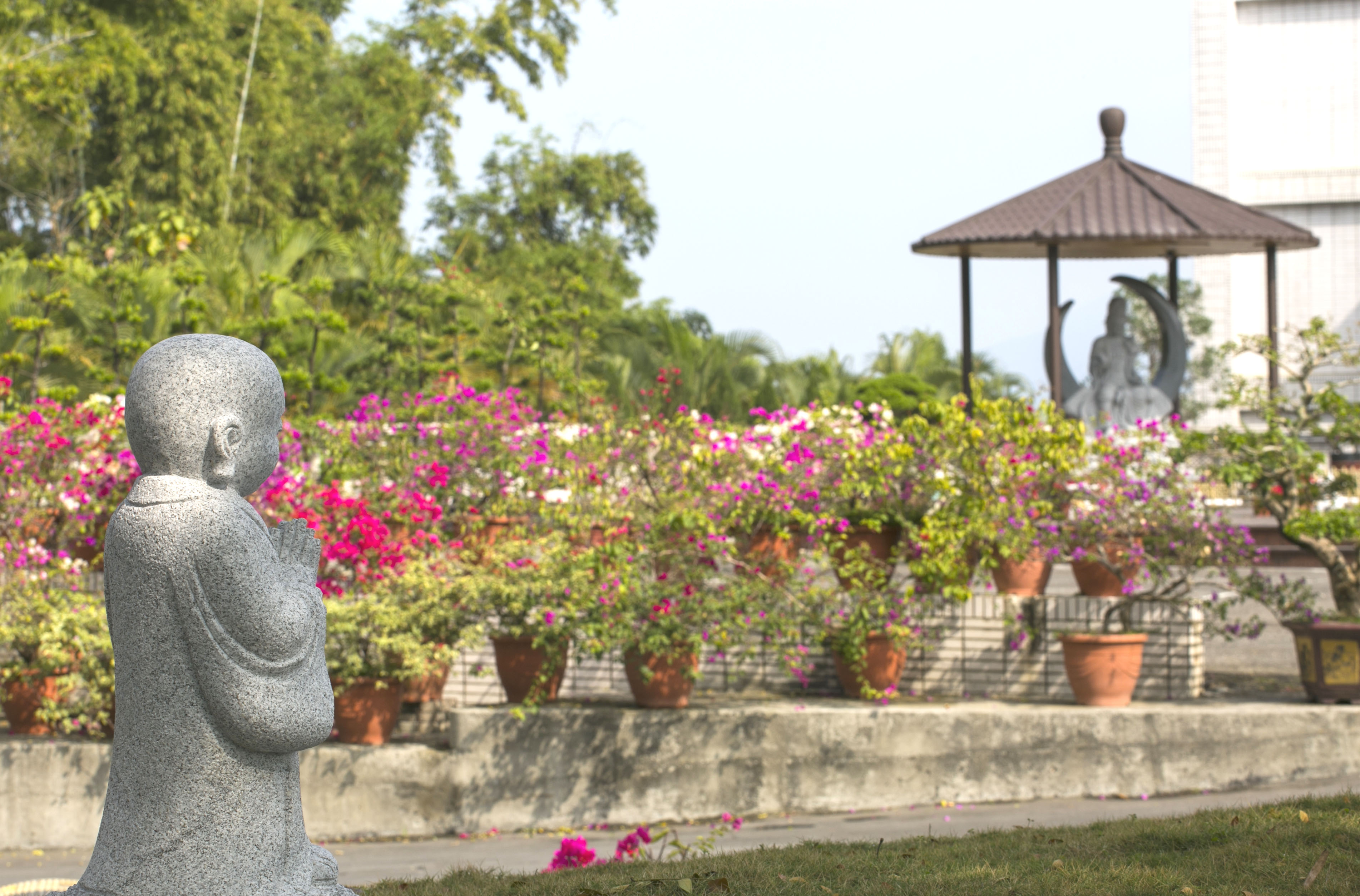 一進大門,右方修整的草坪上矗立著持淨瓶的滴水觀音,微笑觀視著來訪的人;以觀音菩薩為中心,開展出蜿蜒的步道,步道盡頭纍著充滿眾人祈願的摩尼石堆。山門左側是月牙觀音,而眾多小沙彌尼像,在菩薩的凝視下,愜意地持缽、辯經、背書。鄰近大樓門口,立著威嚴的石獅,盡力守護著所有的修行人。