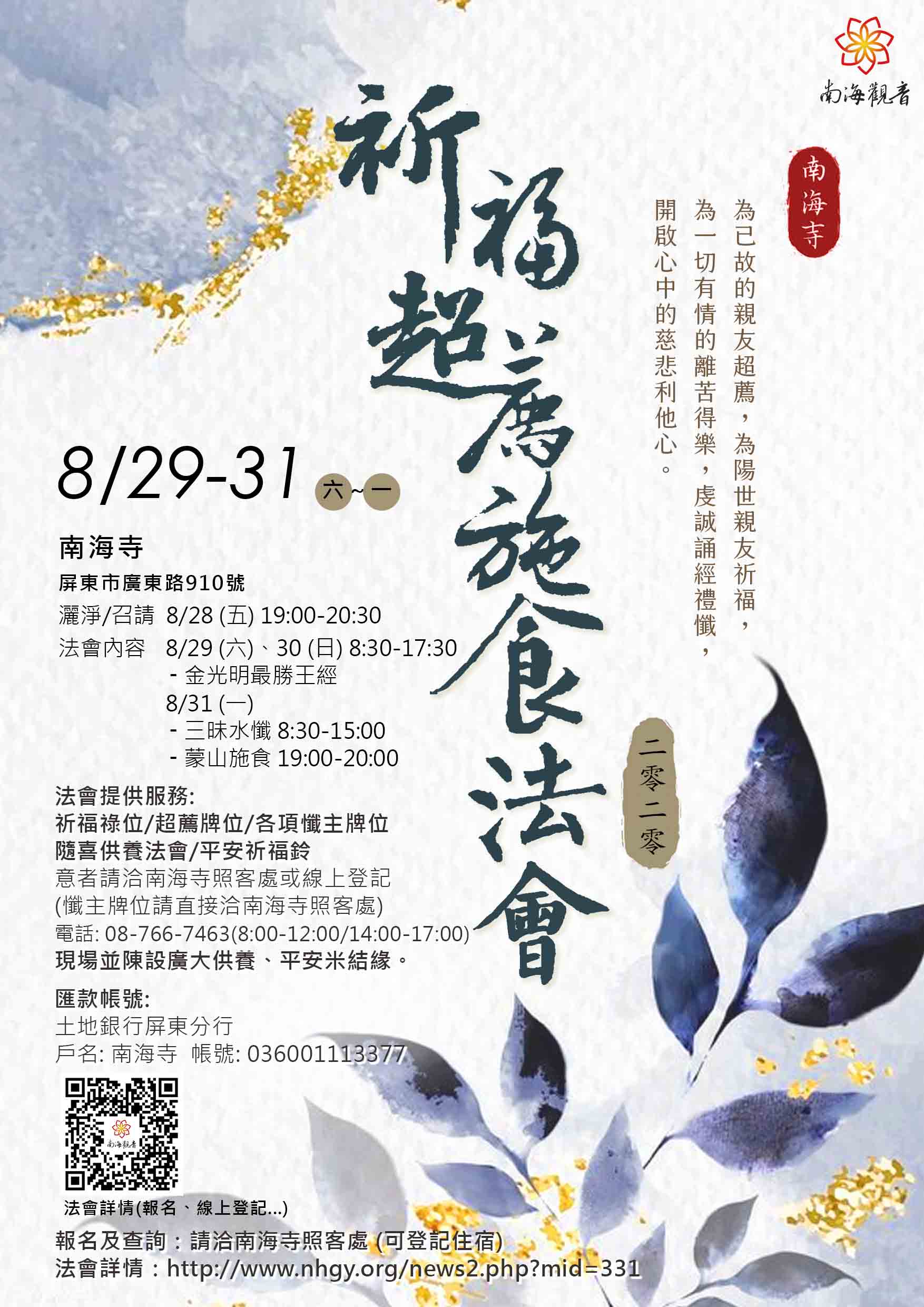 歡迎蒞臨南海寺,共同參與此殊勝法會,為親友超薦祈福,也為世界盡一份心力。