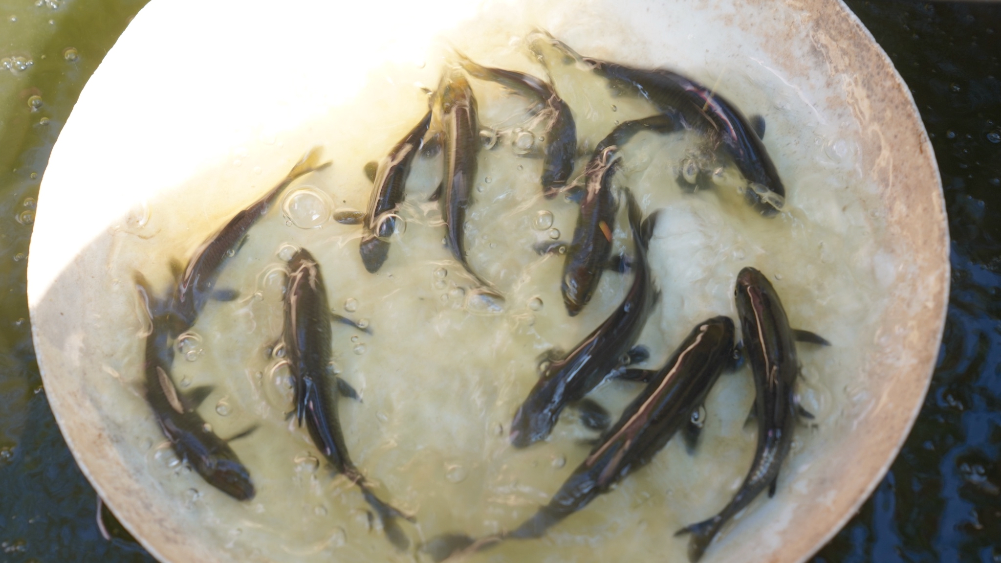 「小魚兒游水裡,擺擺尾轉身去,搖啊搖啊你又來了呀,小小魚兒你幾歲啦……」跟小小魚兒打聲招呼、結個善緣,希望小小魚兒都來皈依三寶。在老和尚親唱的旋律中,大眾為之動容,感動溢於言表。