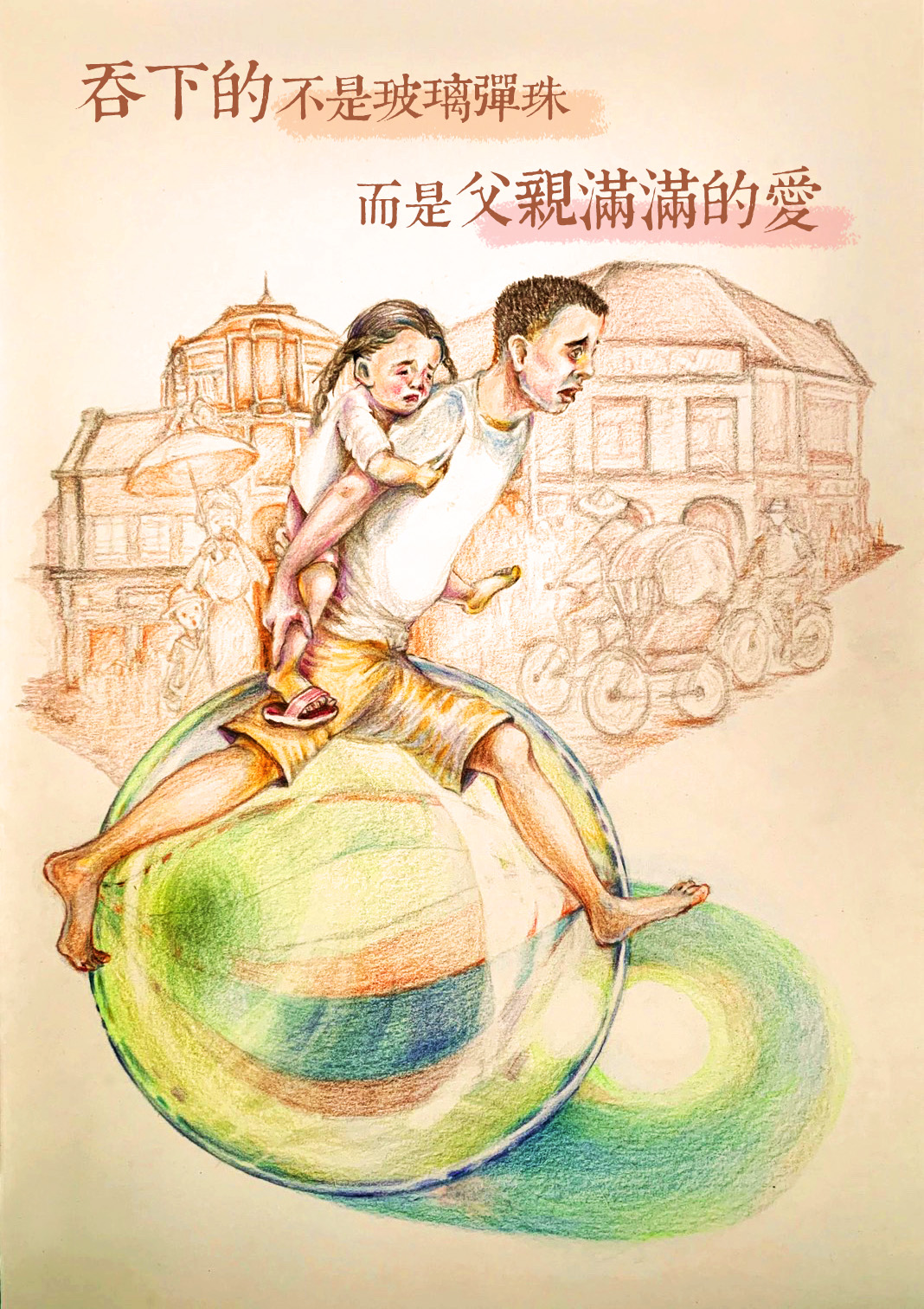 爸爸背著我狂奔至好友執業的診所。醫師得知我已經吞下超過五分鐘,便笑著給我一包藥。回家上完洗手間後,當然逃不過我爸爸的修理,只是那次我被K得心甜甜的,因為我發現爸爸連拖鞋都沒穿,覺得自己好厲害,把爸爸嚇到了…。